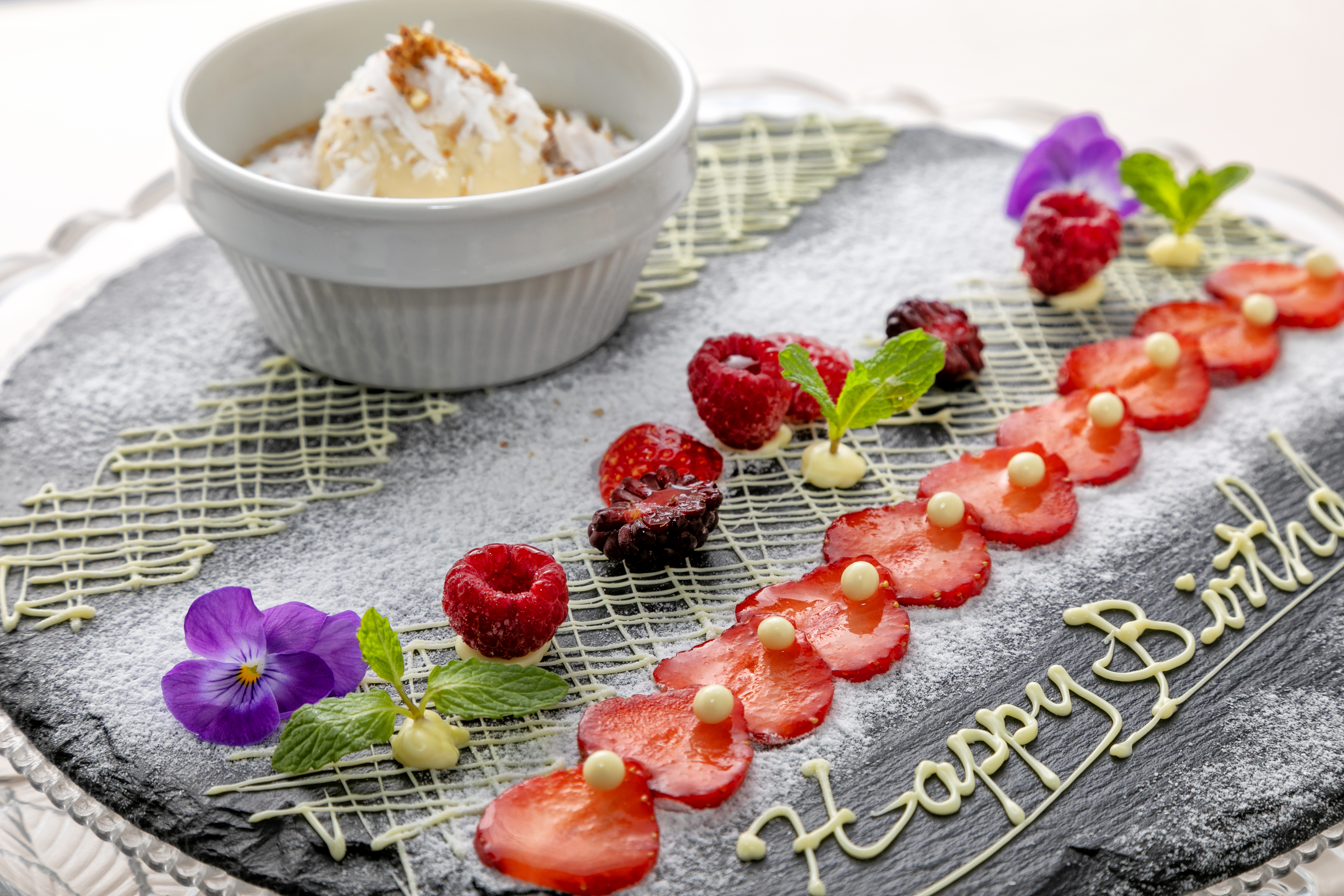 デザートプレートでサプライズ!お誕生日や記念日にシェフがお洒落なデザートプレートの演出いたします。